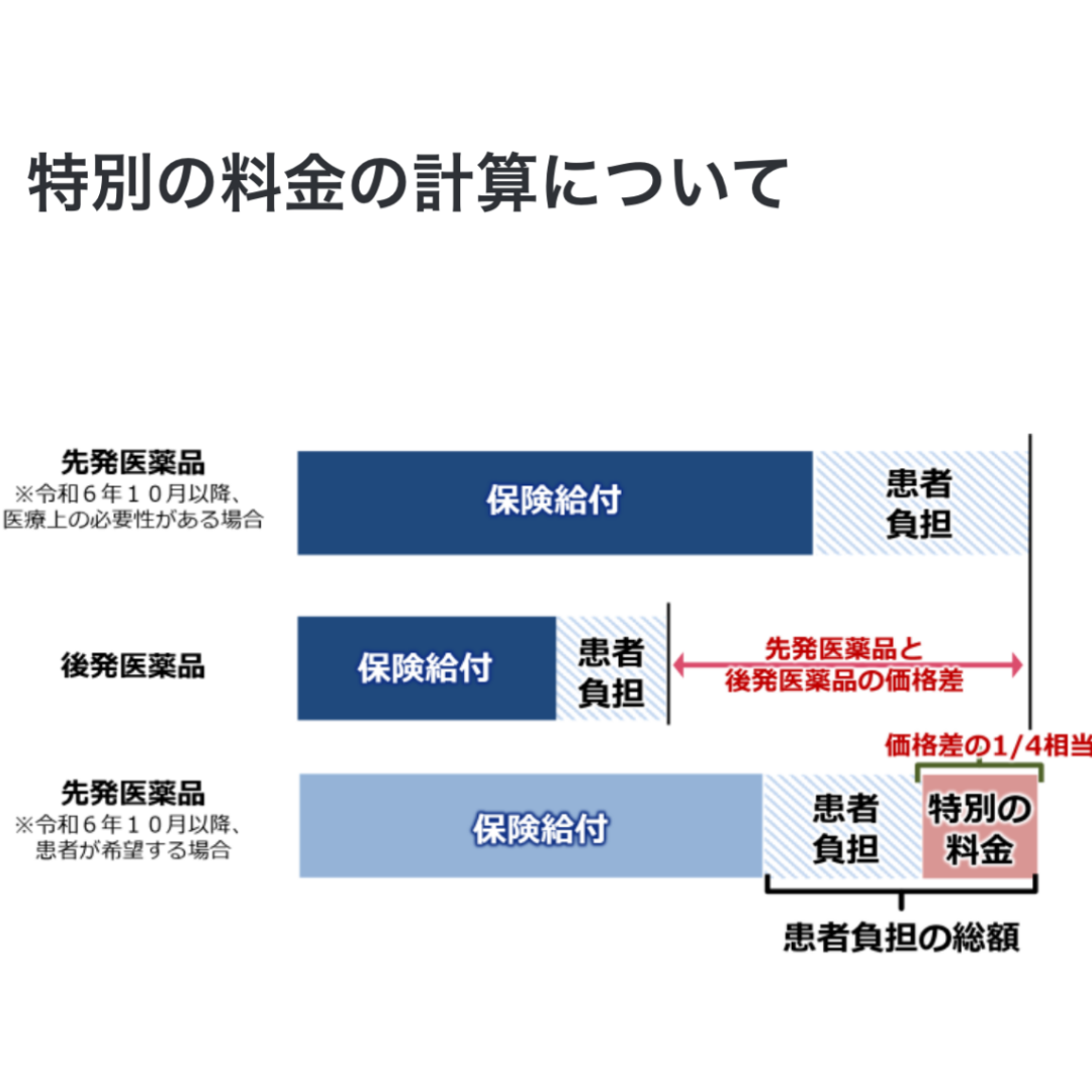 特別の料金とは、先発医薬品と後発医薬品の価格の差の1/4が通常の自己負担額に上乗せとなります。